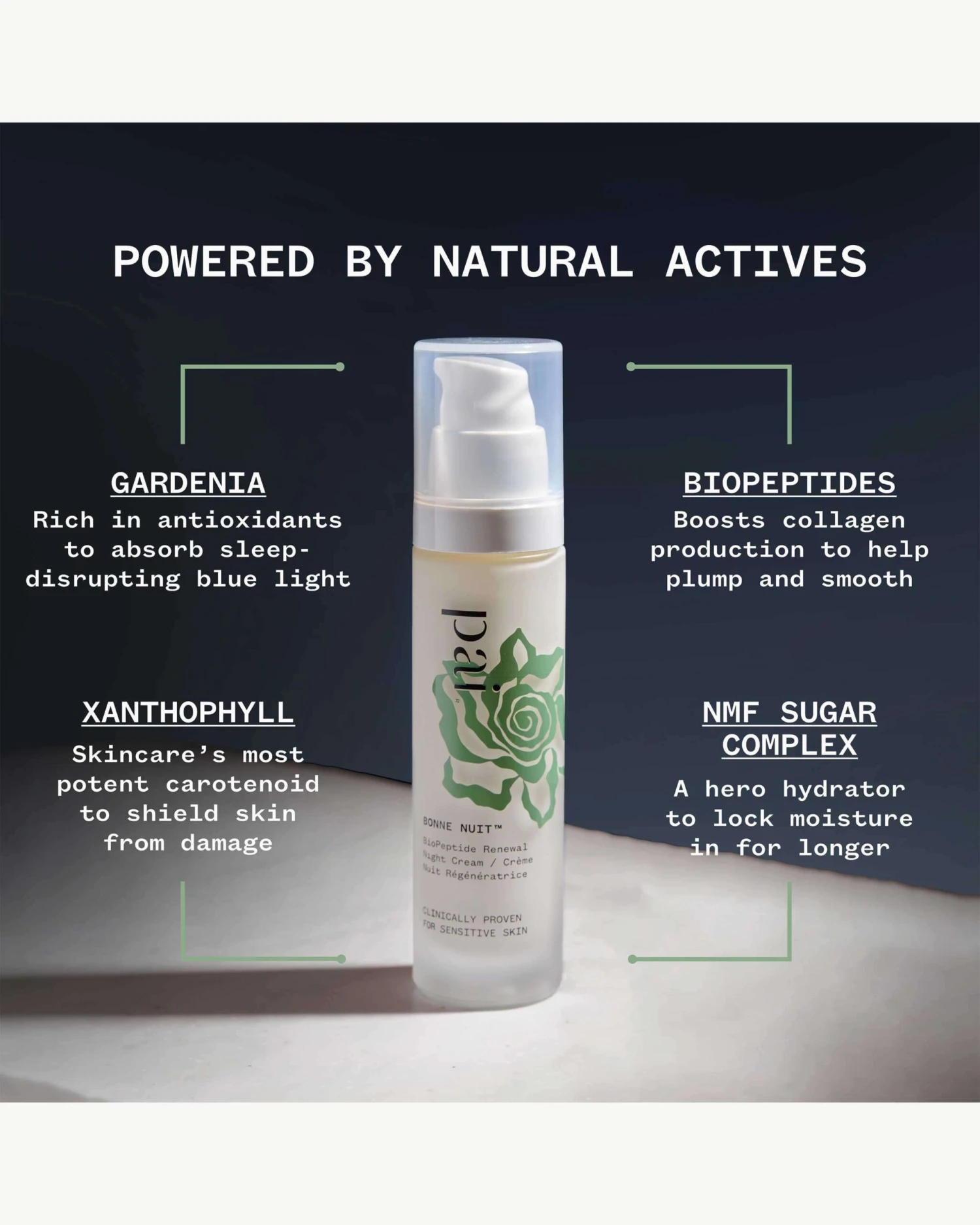 A fatigue-fighting dream cream. Melatonin-mimicking actives and collagen-boosting peptides revitalize even the most sensitive skin – for a less stressed, more restored you. Clinically proven to reduce the appearance of fine lines*, this high-tech formula takes your beauty sleep to the next level. All wrapped up in a relaxing, sensitively-blended scent *Based on a clinical study on 20 subjects over four weeks