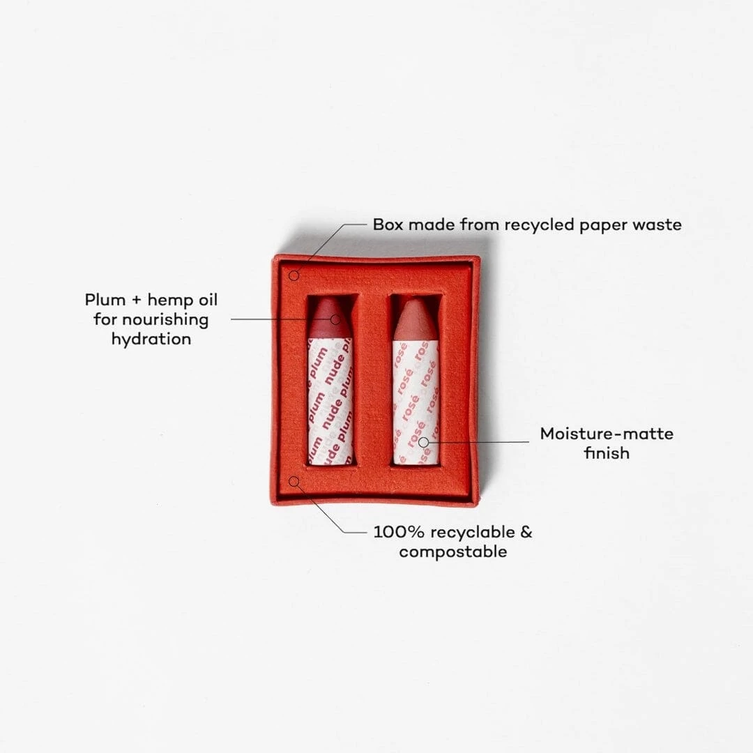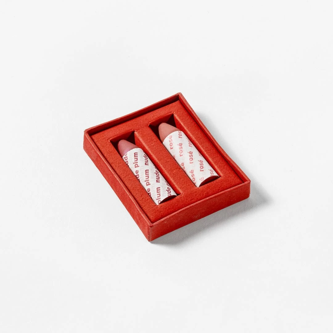 The product is: Set of two multi-use crayons for eyes, lips, and cheeks. Totally plastic free!