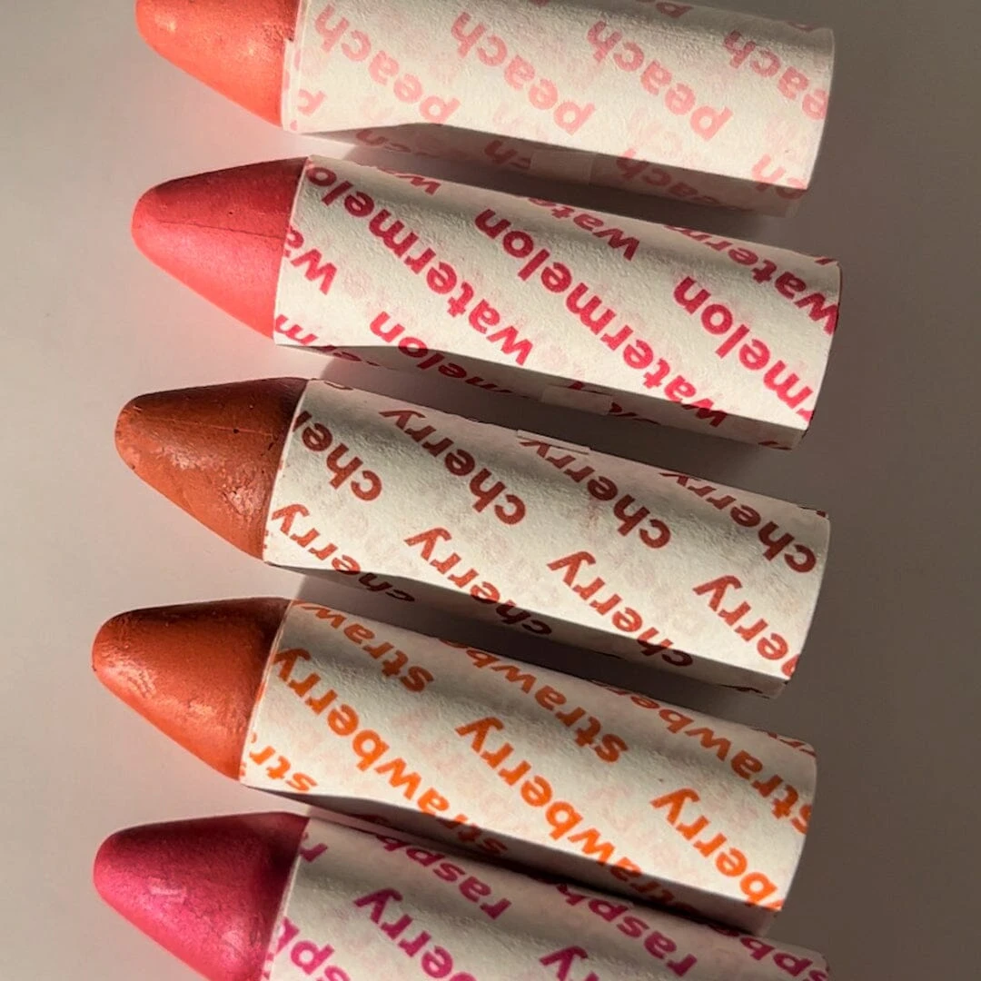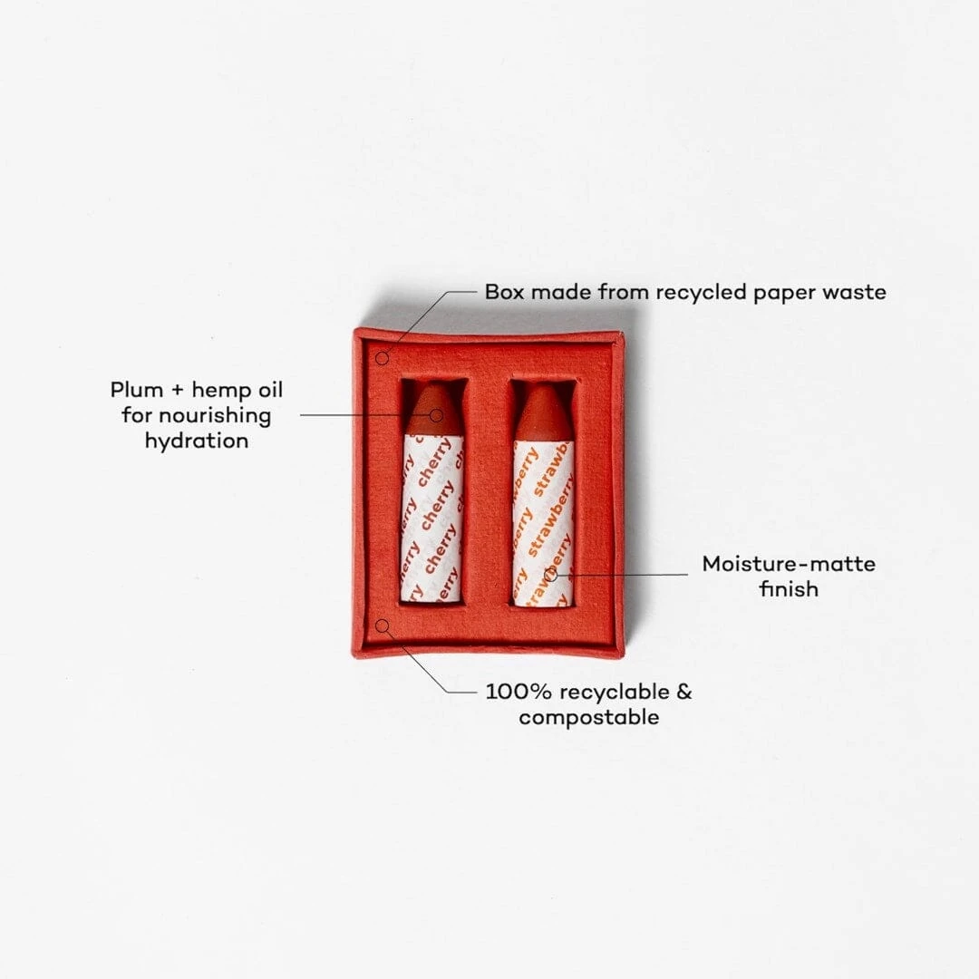 The product is: Set of two multi-use crayons for eyes, lips, and cheeks. Totally plastic free!