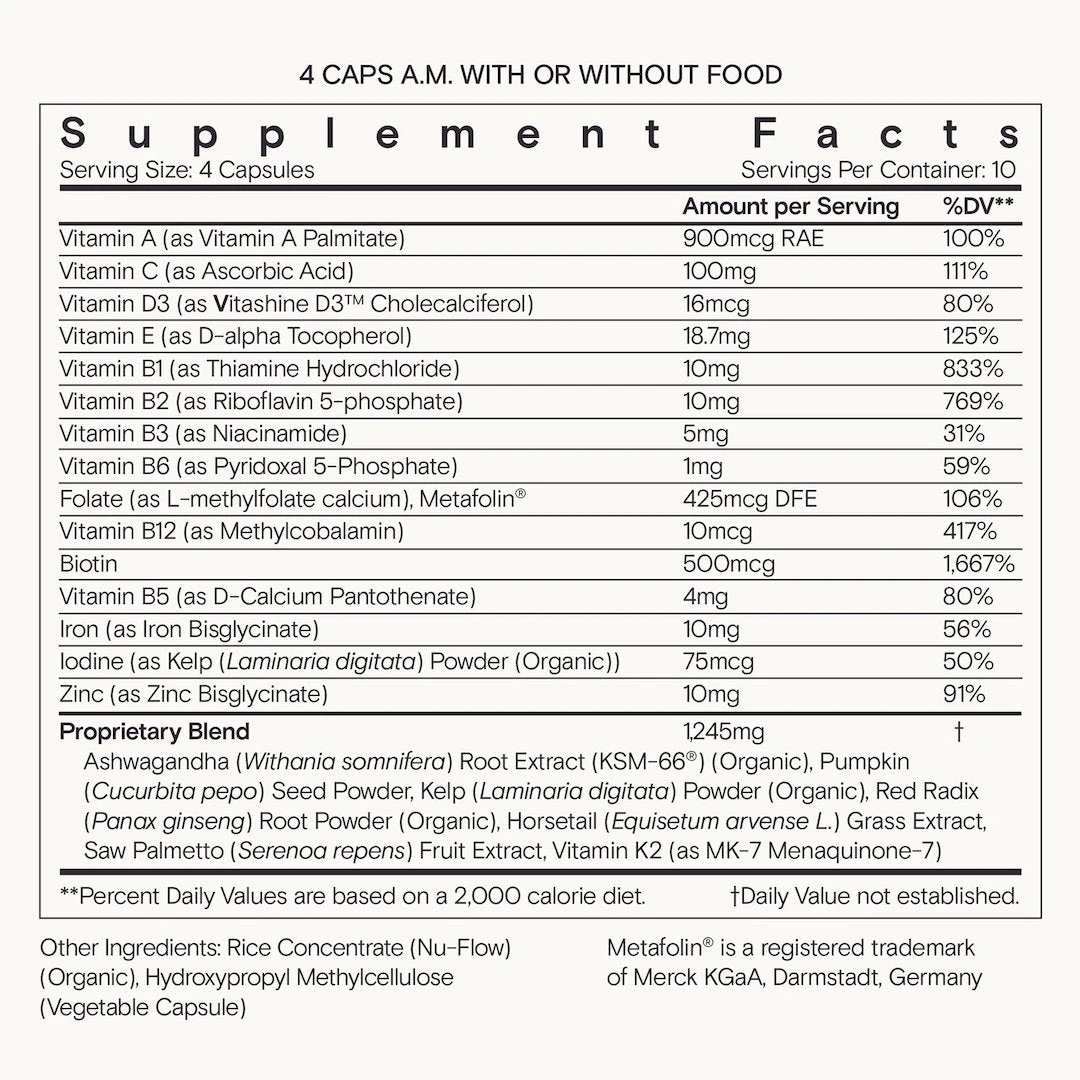 1. Target stress with adaptogens* – Organic ashwagandha & ginseng help balance stress hormones and reduce the effects of oxidative stress, which can contribute to hair loss*